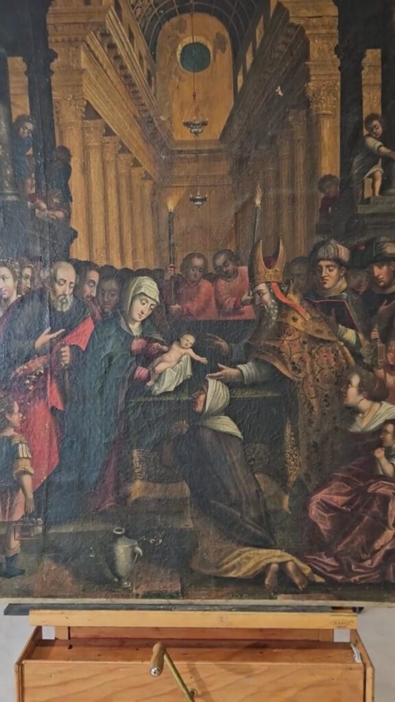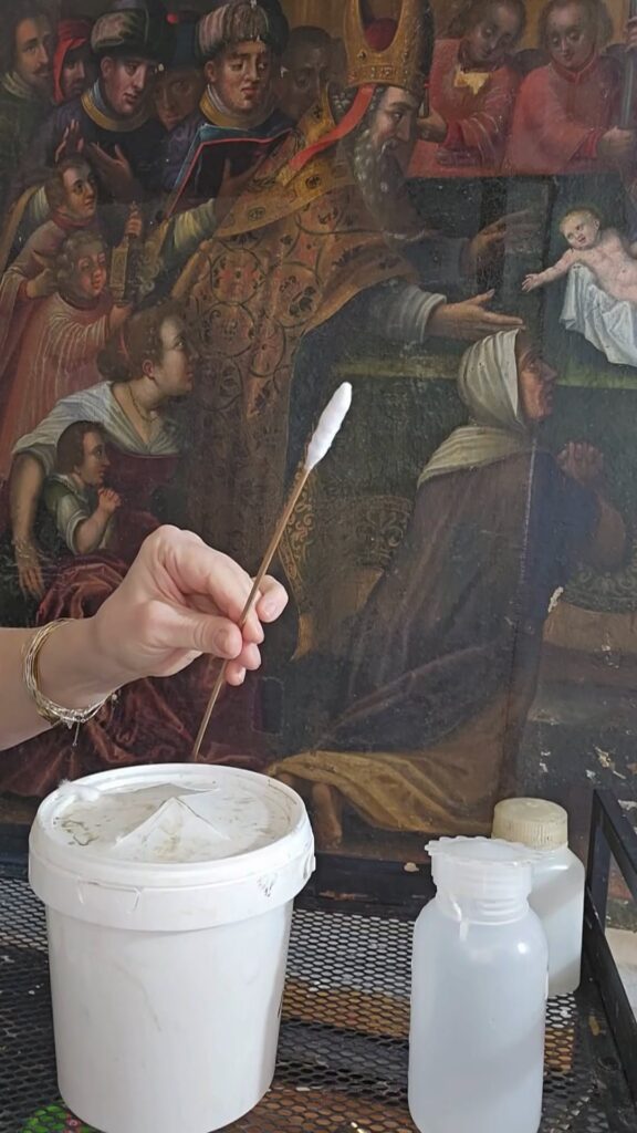 Les opérations de conservation terminées j’ai pu intervenir sur la couche picturale. Elle présentait plusieurs altérations : une épaisse couche de crasse, un vernis oxydé devenu très jaune, des repeints et des mastics d’une précédente restauration. Ils étaient dénaturés et débordants sur la couche picturale.