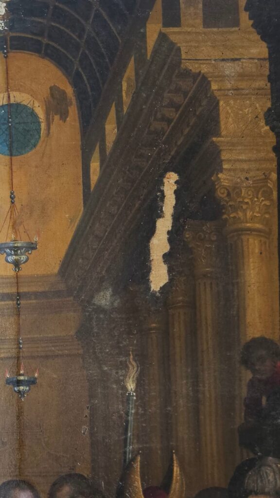 La toile originale de ce tableau a été affaibli par de nombreuses ruptures de toile et une ancienne restauration qui a mal vieilli. Le retrait de la toile de rentoilage et des résidus de colle a aussi fragilisé le support. En effet, la toile originale avait perdu sa souplesse et sa résistance mécanique. Le collage d’un nouveau renfort était indispensable. J’ai opté pour un doublage synthétique léger.