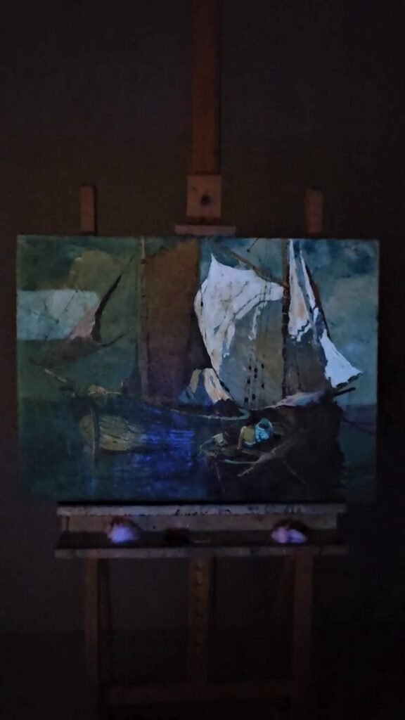 Lors d’une intervention de restauration, l’examen du tableau sous lumière ultraviolette permet de mieux comprendre l’état de surface de l’œuvre, notamment la nature et l’état du vernis. Cette observation est particulièrement utile lorsque le vernis est altéré, hétérogène ou recouvre d’anciennes interventions, rendant nécessaire un retrait maîtrisé.