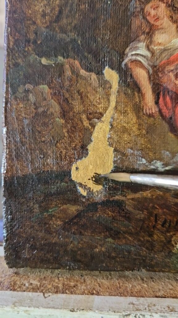 Au fil du temps, un tableau peut présenter des pertes de matière picturale, appelées lacunes, qui altèrent la lecture de l’œuvre et peuvent détourner l’attention du spectateur. La réintégration colorée est une étape de restauration visant à restituer visuellement ces zones manquantes, tout en respectant l’authenticité de l’œuvre.