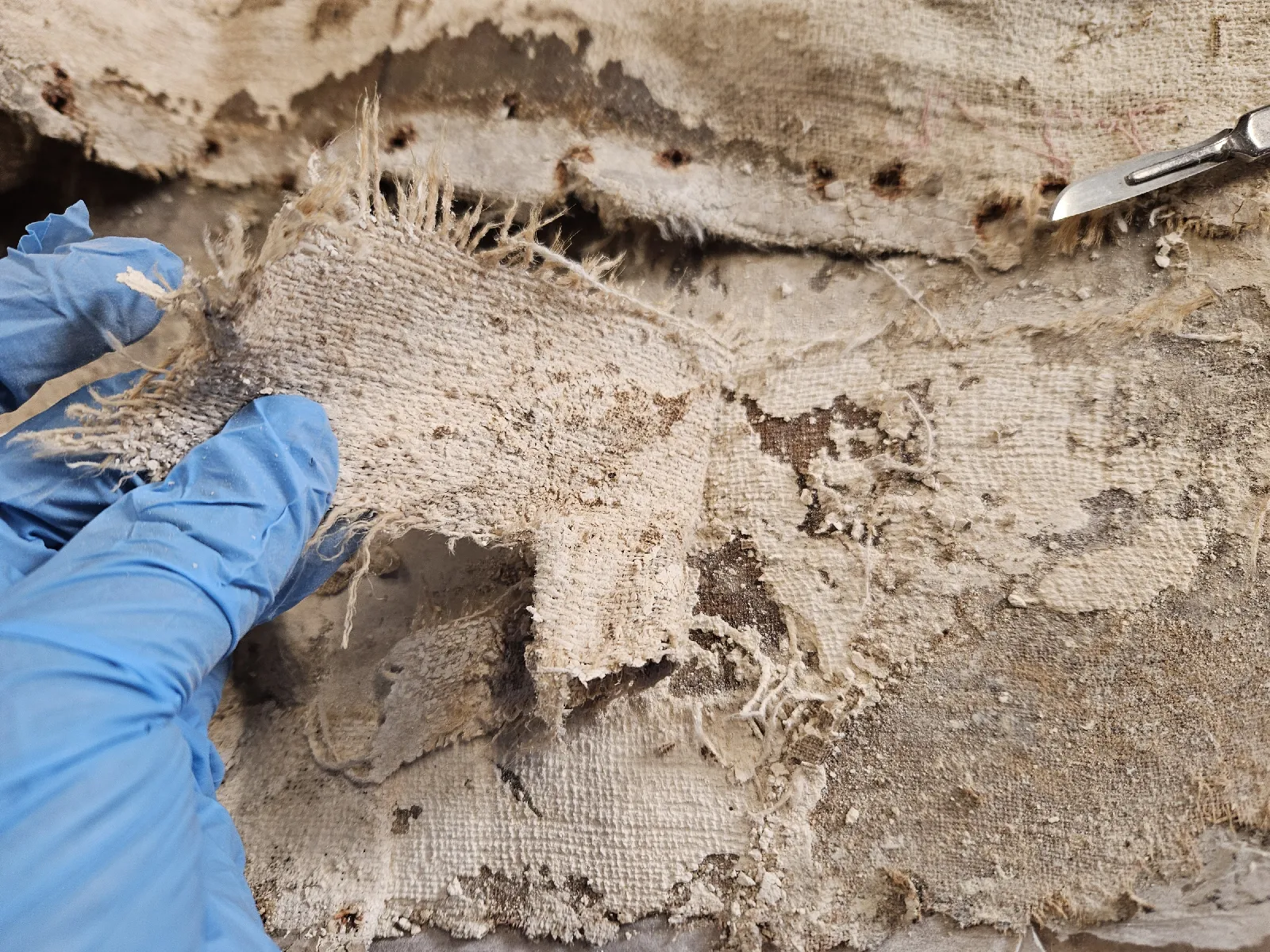 Si la toile est déchirée, on procèdera à la « soudure » de la déchirure de la même manière (fil à fil), puis par la pose d’une pièce en fibre de verre ou en intissé très fin, afin qu’il n’y ait aucune remontée de cette pièce par la face.