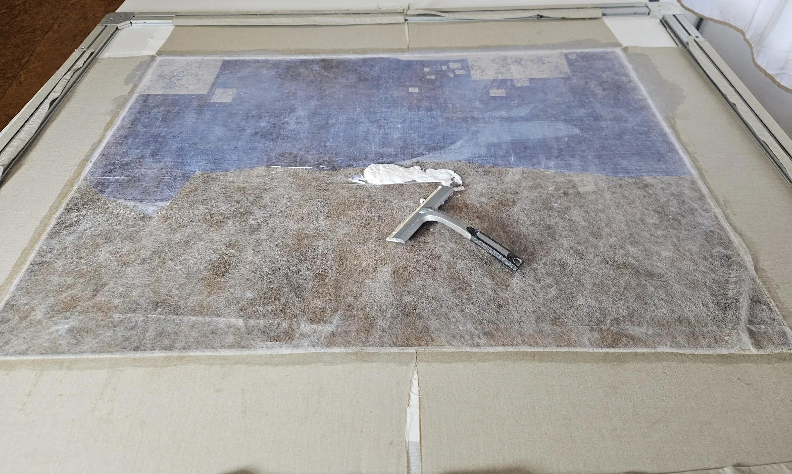 La toile est tendue sur un bâti de travail, nous pouvons alors humidifier en toute sécurité le revers à l’aide d’un vaporisateur. Après quelques minutes d’attente, le temps que les fibres de la toile se détendent, nous passons un fer chaud sur l’ensemble du revers. Nous retrouvons ainsi la planéïté d’origine. Cette opération peut être réalisée sur une table chauffante à basse pression, qui est une table équipée de buses d’aspiration et d’un système de chauffage électrique. La basse pression, entre la membrane supérieure et le plateau chauffant, est obtenue par une pompe à vide et contrôlée à l’aide d’un manomètre. Cet appareil permet d’obtenir un travail régulier en toute sécurité.