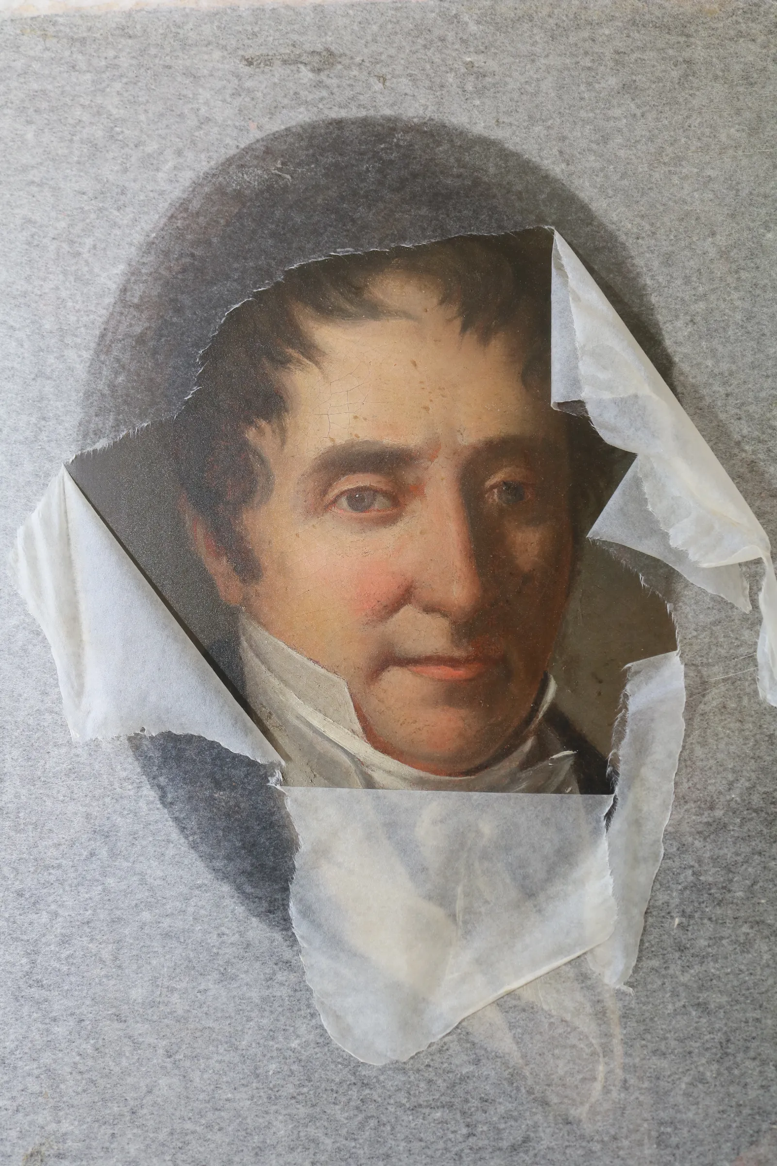 Pour protéger la couche picturale d’une œuvre soulevée et en perte d’adhésion, nous posons directement sur celle-ci un papier comme le papier japon ou papier boloré collé avec une méthylcellulose. C’est une pratique totalement réversible qui permet de manipuler et de transporter un tableau sans risque de perdre la moindre écaille.