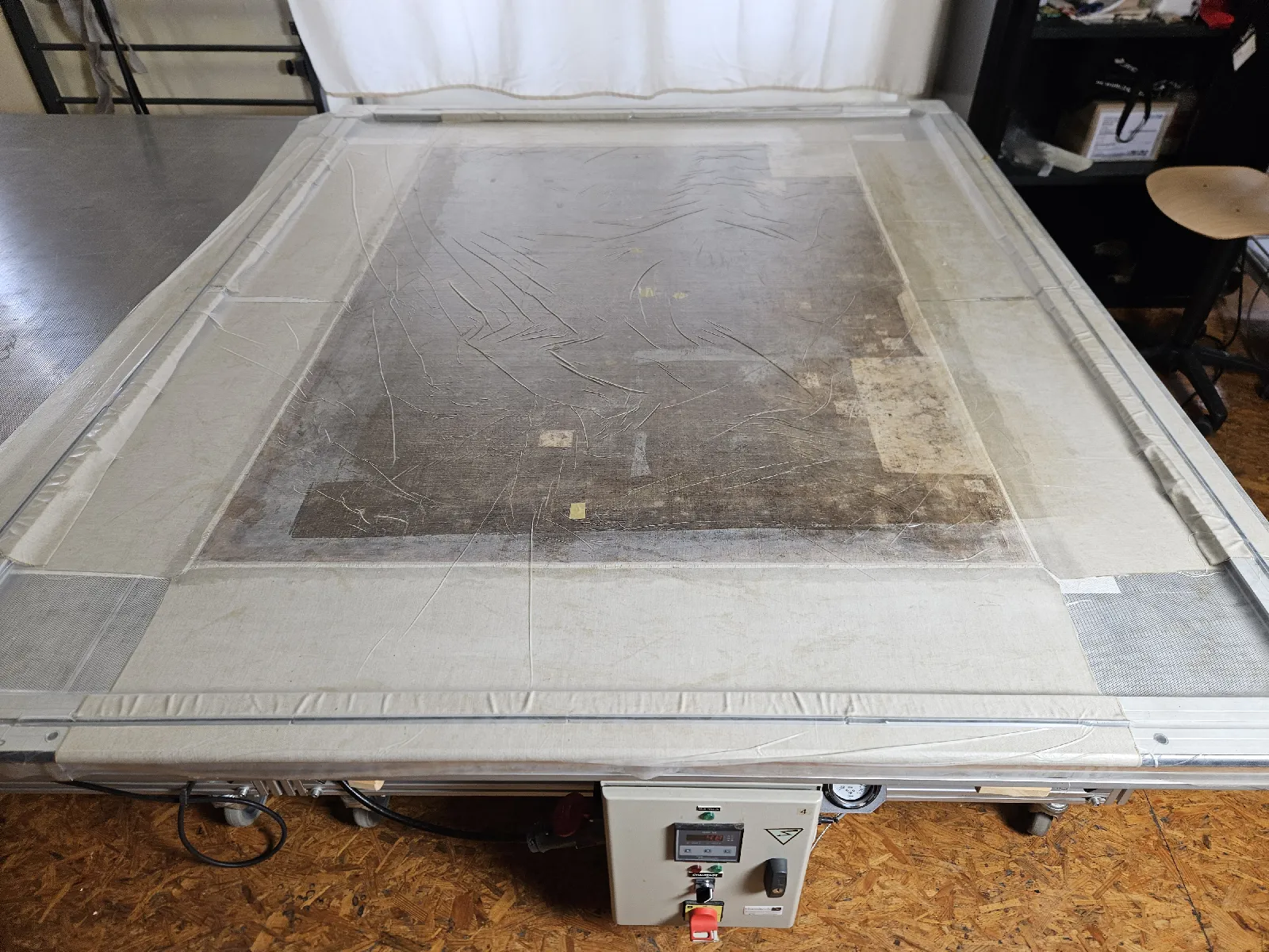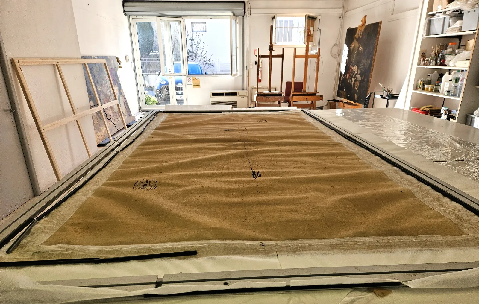 Pour résorber les déformations  d’une toile, nous utilisons trois paramètres simultanés : humidité, pression et chaleur.