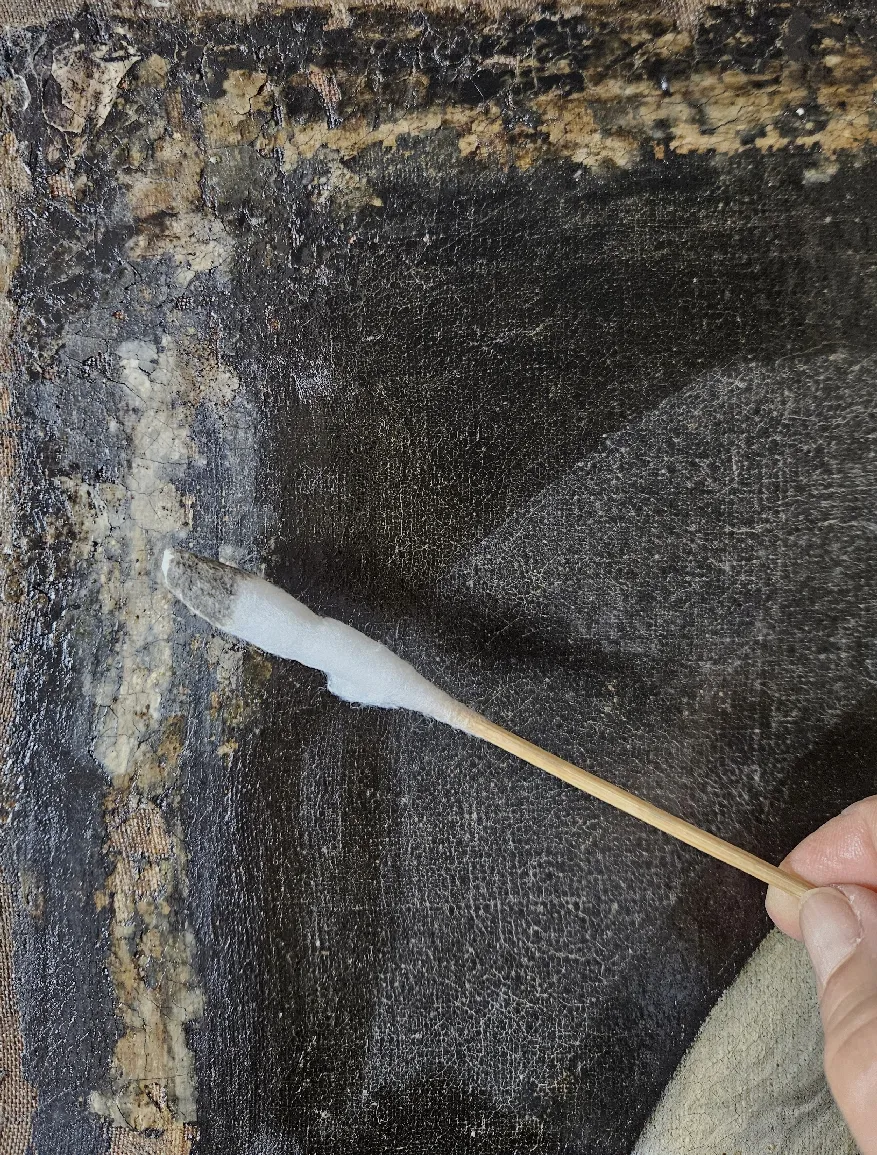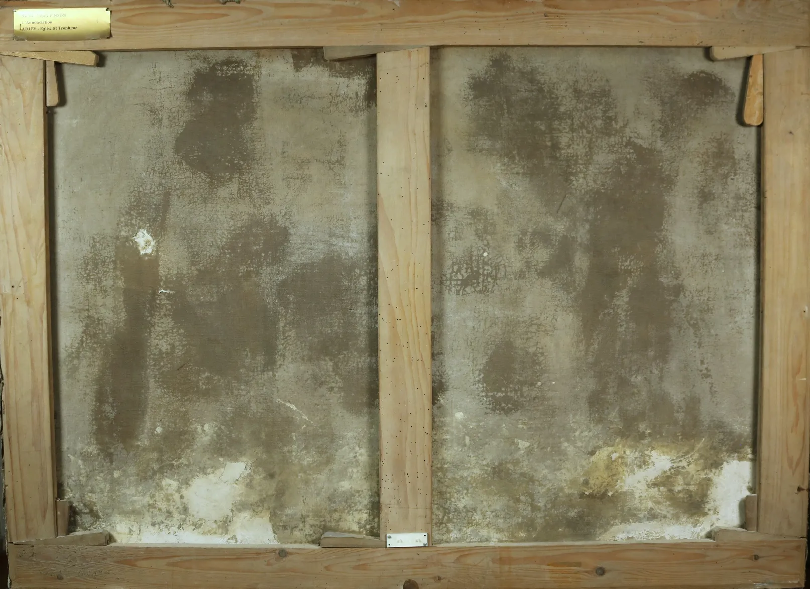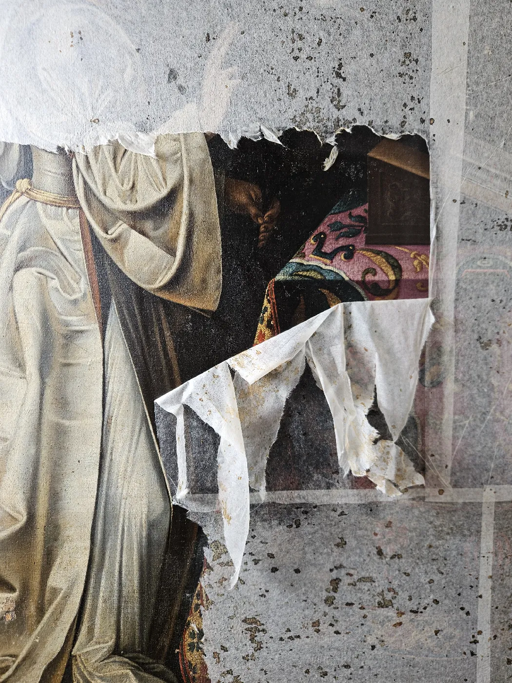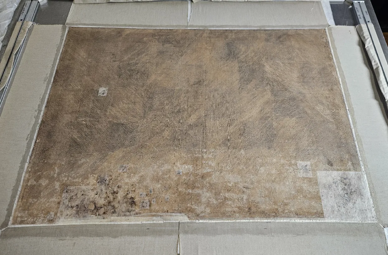 Il était primordial d’assainir le revers afin de retirer toutes les contraintes à l’origine des altérations : un papier de protection a été collé sur la couche picturale, la toile a été déposée de son châssis et tendue sur un bâti extensible de travail. Les anciennes pièces ont été retirées ainsi que les excédents de colle et l’enduit cireux. Ces retraits se sont fait mécaniquement au scalpel en avançant progressivement par damier afin d’éviter de trop contraindre le support. Les déchirures ont été consolidées puis renforcées par des pièces. Une colle d’esturgeon a été passé au revers afin de refixer la couche picturale au support. La toile extrêmement fragilisée par l’ancienne restauration et cette dérestauration a été renforcée par un doublage synthétique.