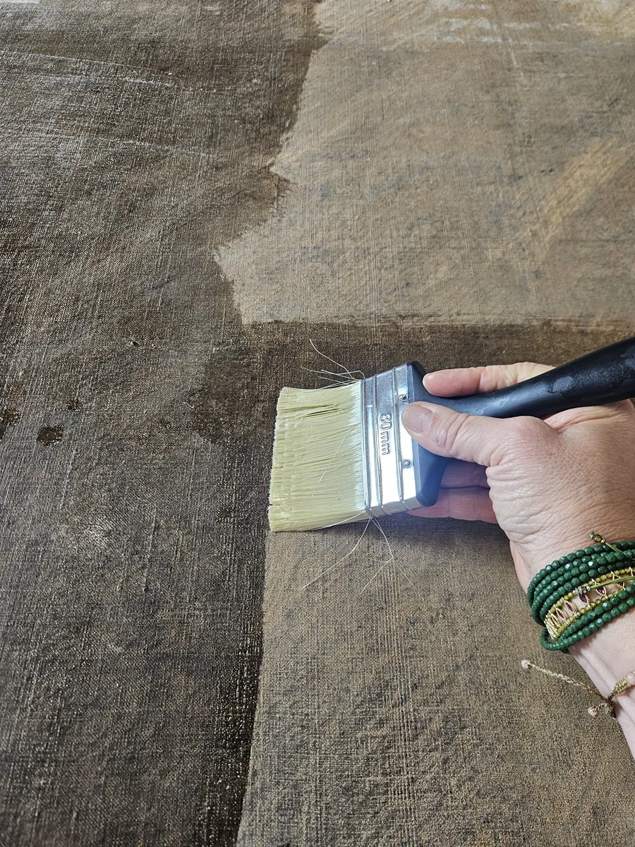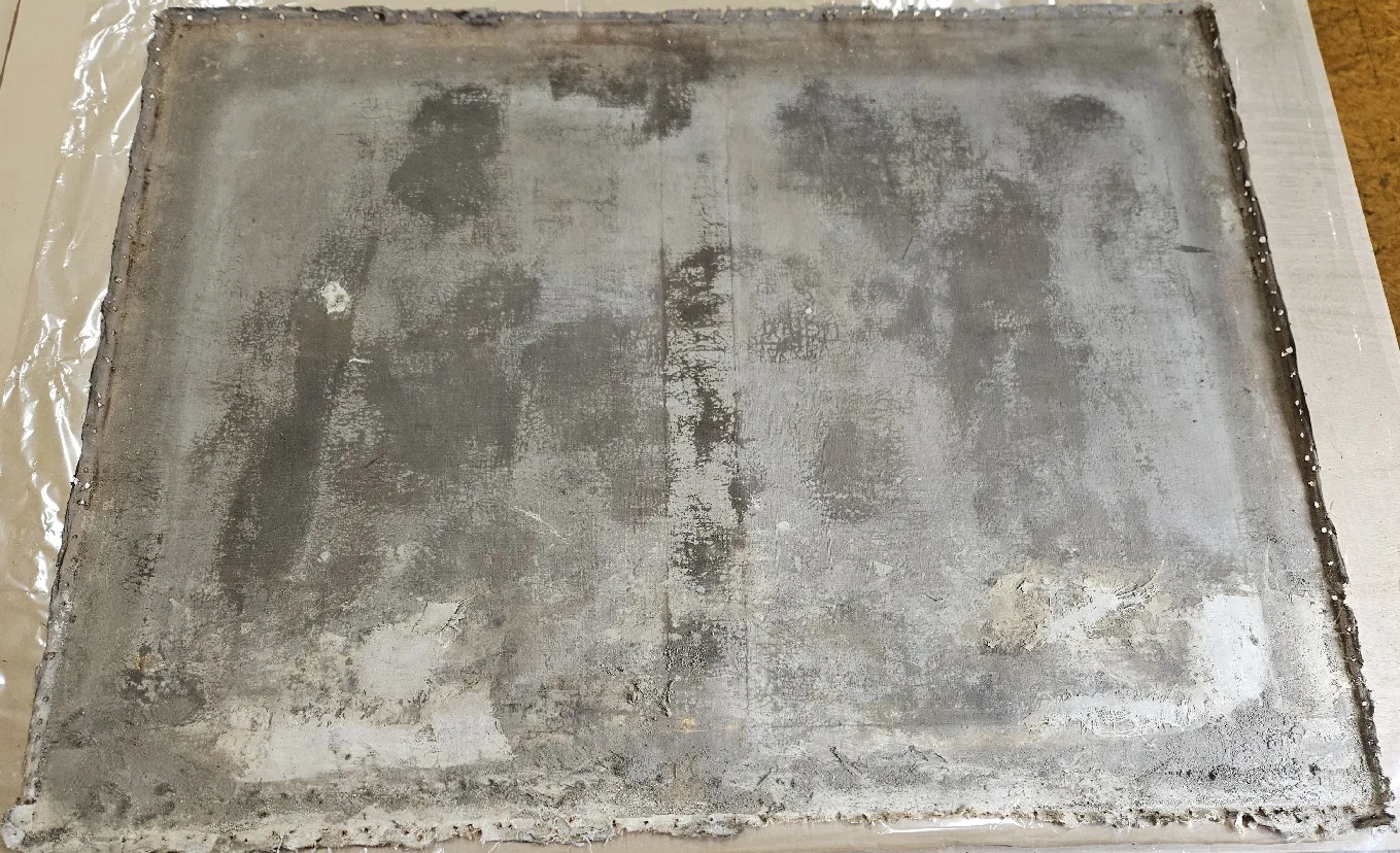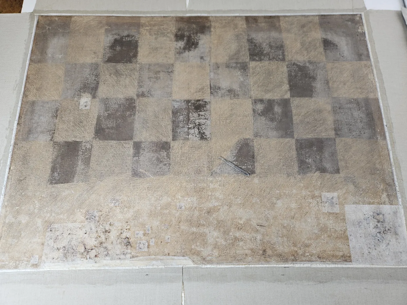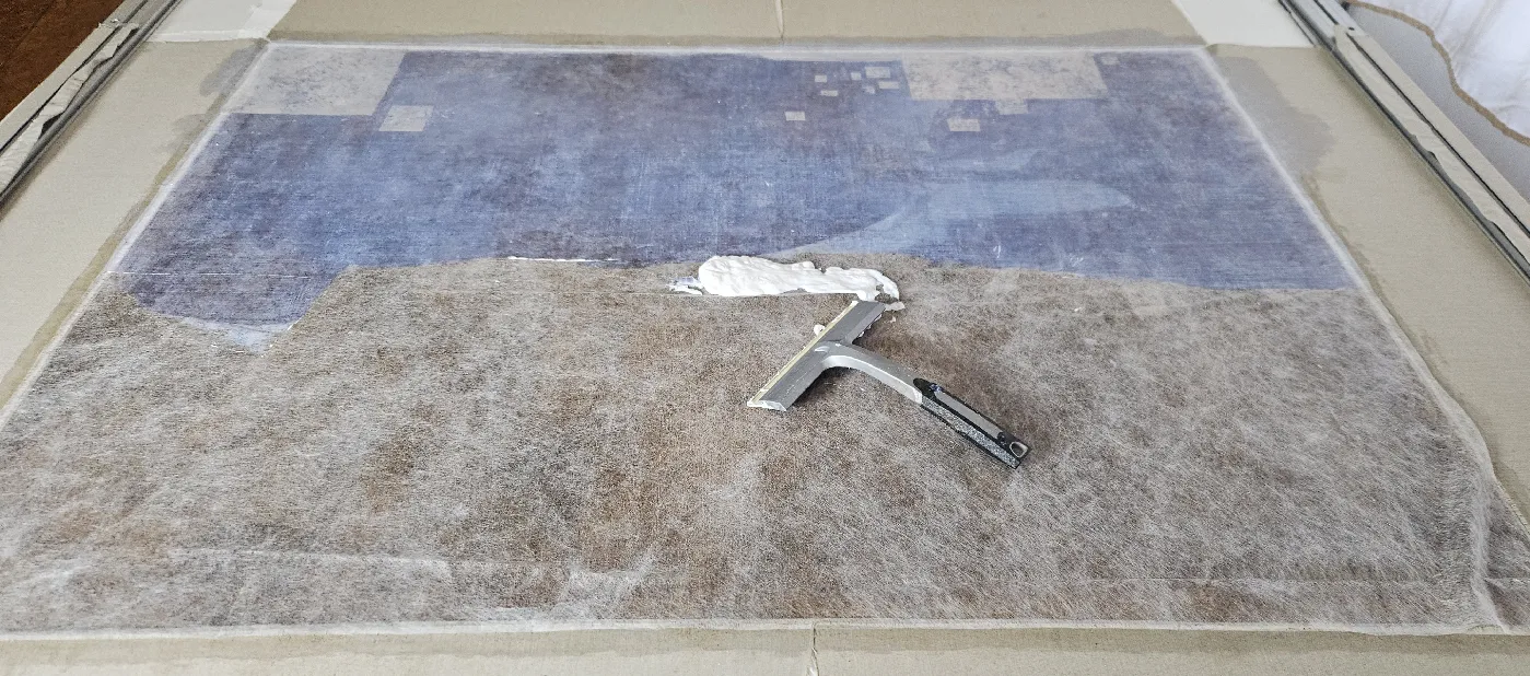 Il était primordial d’assainir le revers afin de retirer toutes les contraintes à l’origine des altérations : un papier de protection a été collé sur la couche picturale, la toile a été déposée de son châssis et tendue sur un bâti extensible de travail. Les anciennes pièces ont été retirées ainsi que les excédents de colle et l’enduit cireux. Ces retraits se sont fait mécaniquement au scalpel en avançant progressivement par damier afin d’éviter de trop contraindre le support. Les déchirures ont été consolidées puis renforcées par des pièces. Une colle d’esturgeon a été passé au revers afin de refixer la couche picturale au support. La toile extrêmement fragilisée par l’ancienne restauration et cette dérestauration a été renforcée par un doublage synthétique.