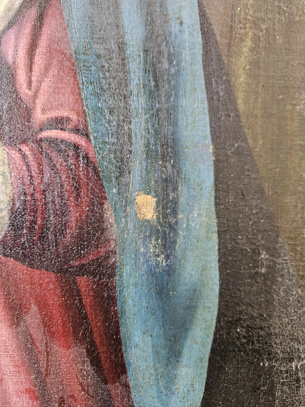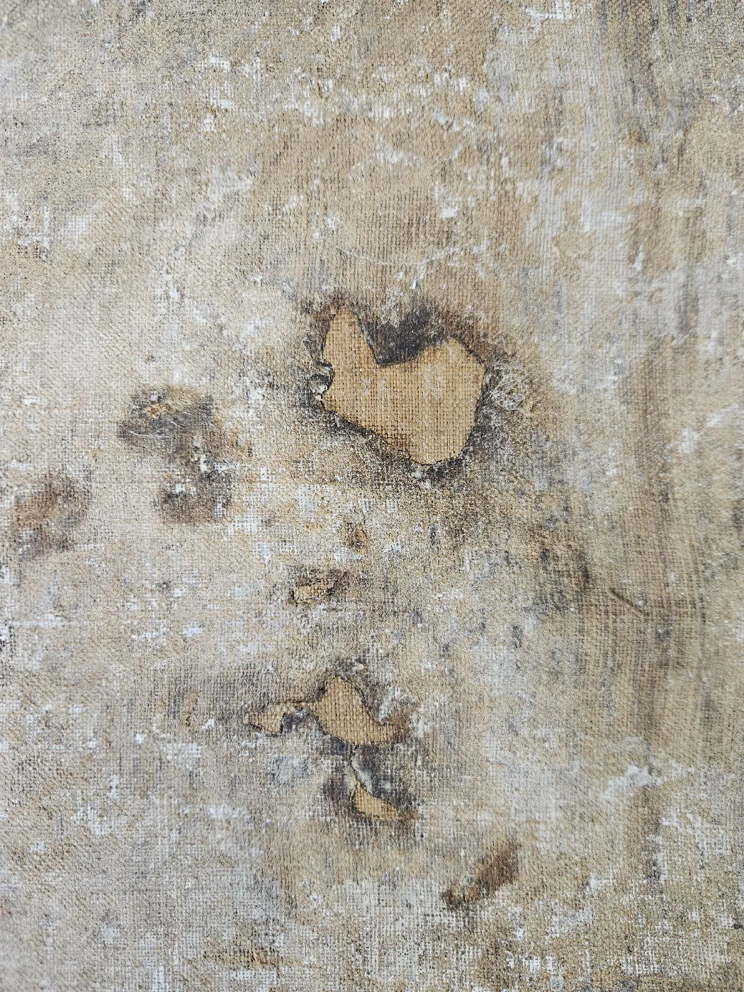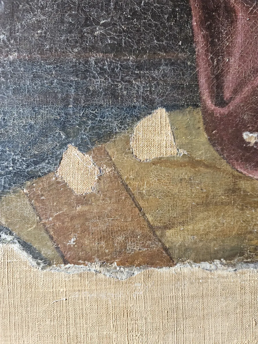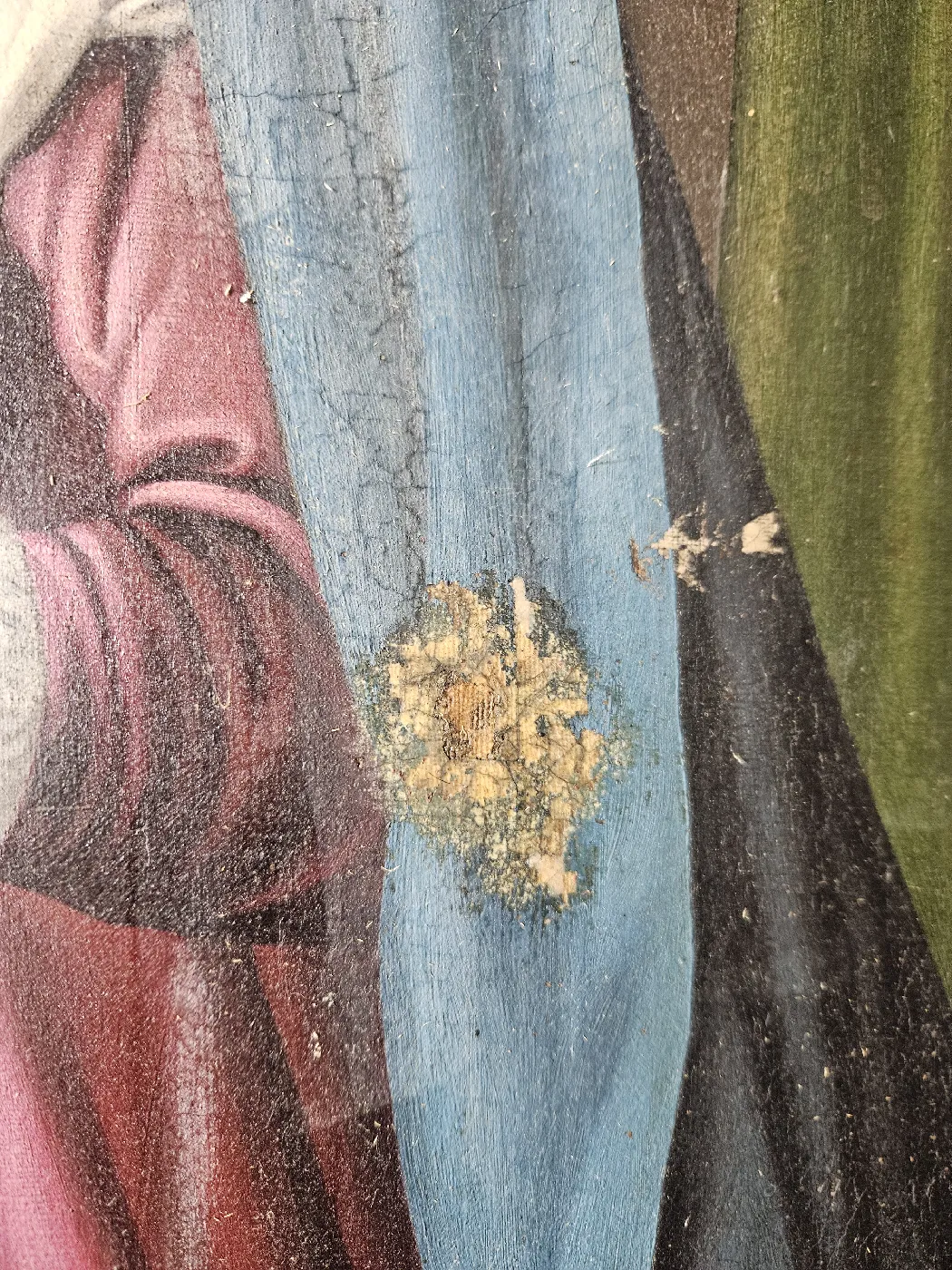 -Au niveau du support : une ancienne restauration grossière a mal évolué et a entrainé plusieurs altérations. Des pièces de différente natures très épaisses collées sur la partie inférieure du revers ont déformé la toile et engendré des soulèvements et des lacunes. Elles renforcées des anciennes déchirures. Une fine couche d’enduit cireux était passée sur le revers contraignant le support.
