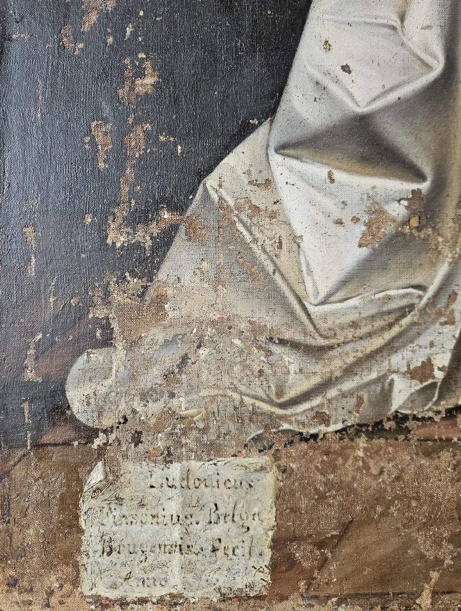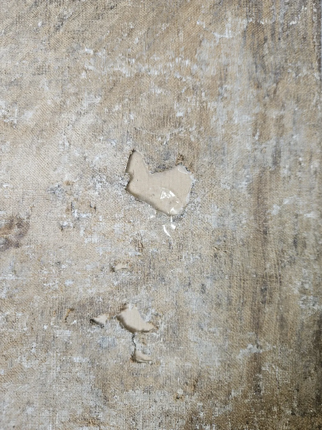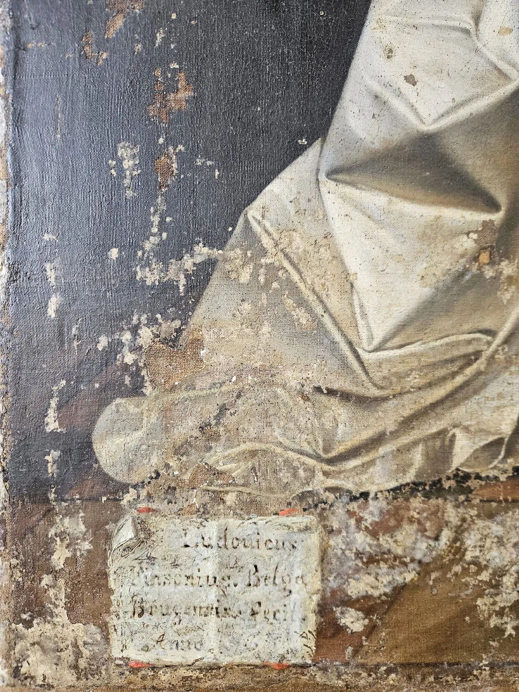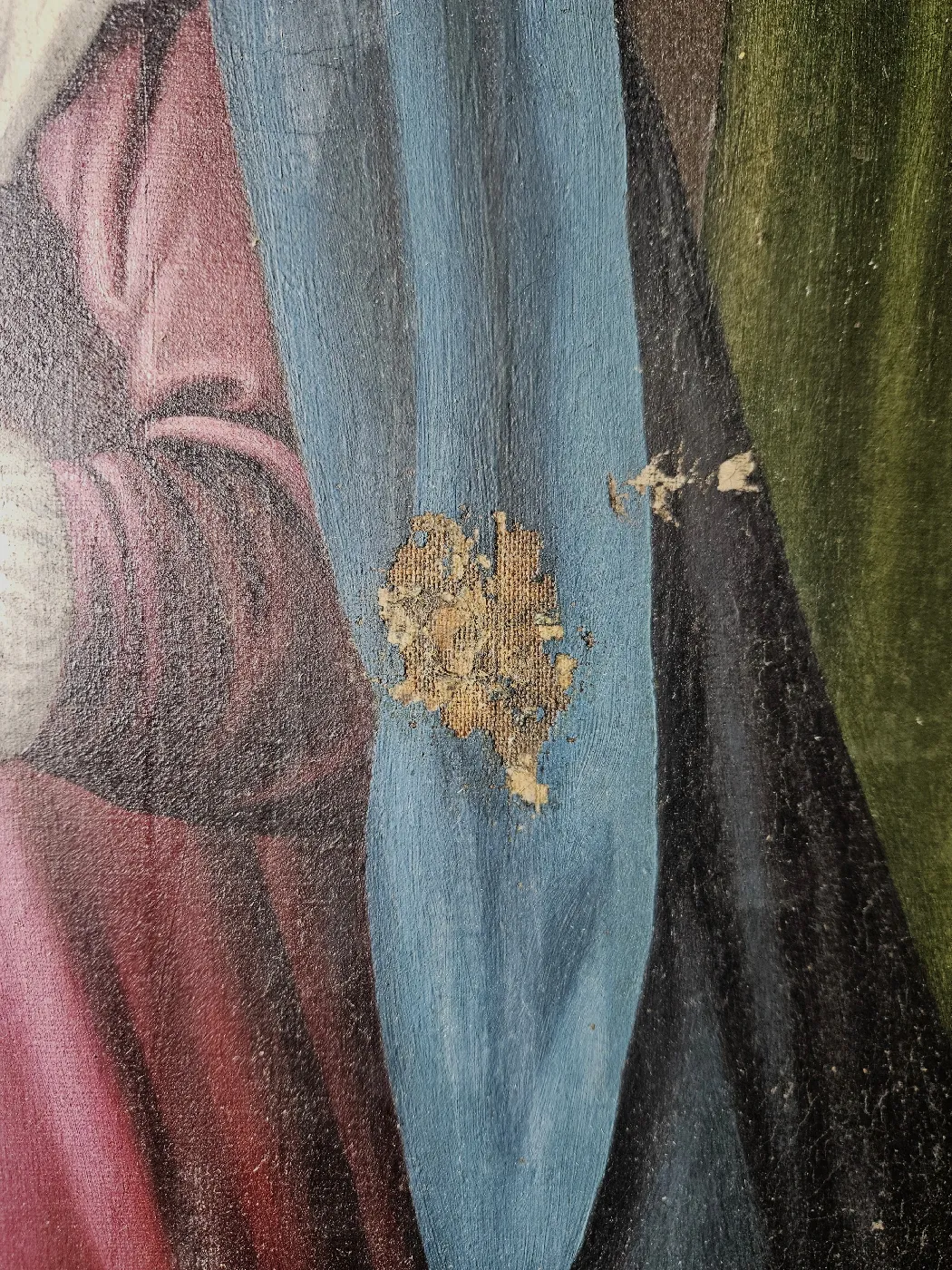 -Au niveau du support : une ancienne restauration grossière a mal évolué et a entrainé plusieurs altérations. Des pièces de différente natures très épaisses collées sur la partie inférieure du revers ont déformé la toile et engendré des soulèvements et des lacunes. Elles renforcées des anciennes déchirures. Une fine couche d’enduit cireux était passée sur le revers contraignant le support.