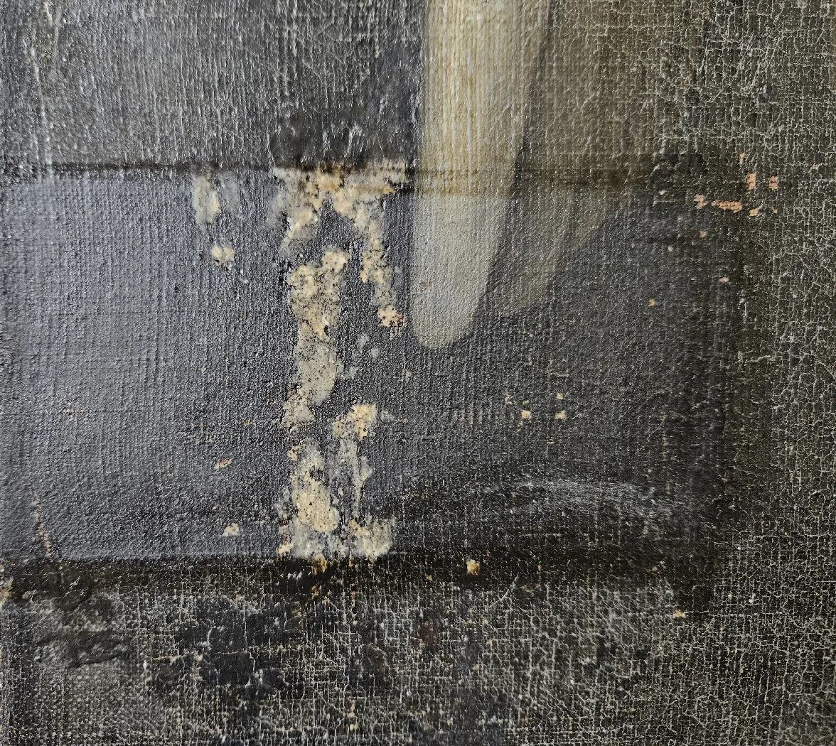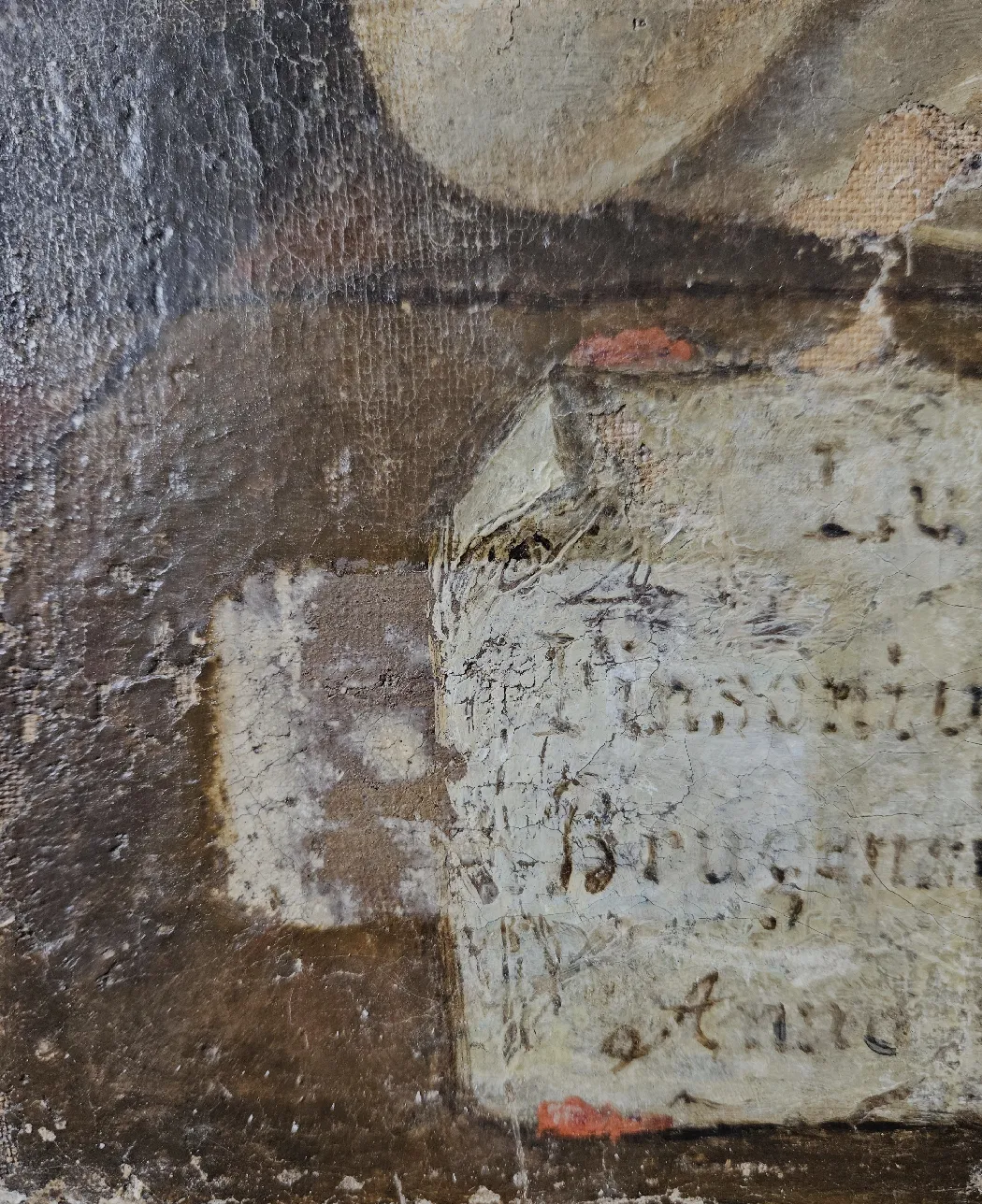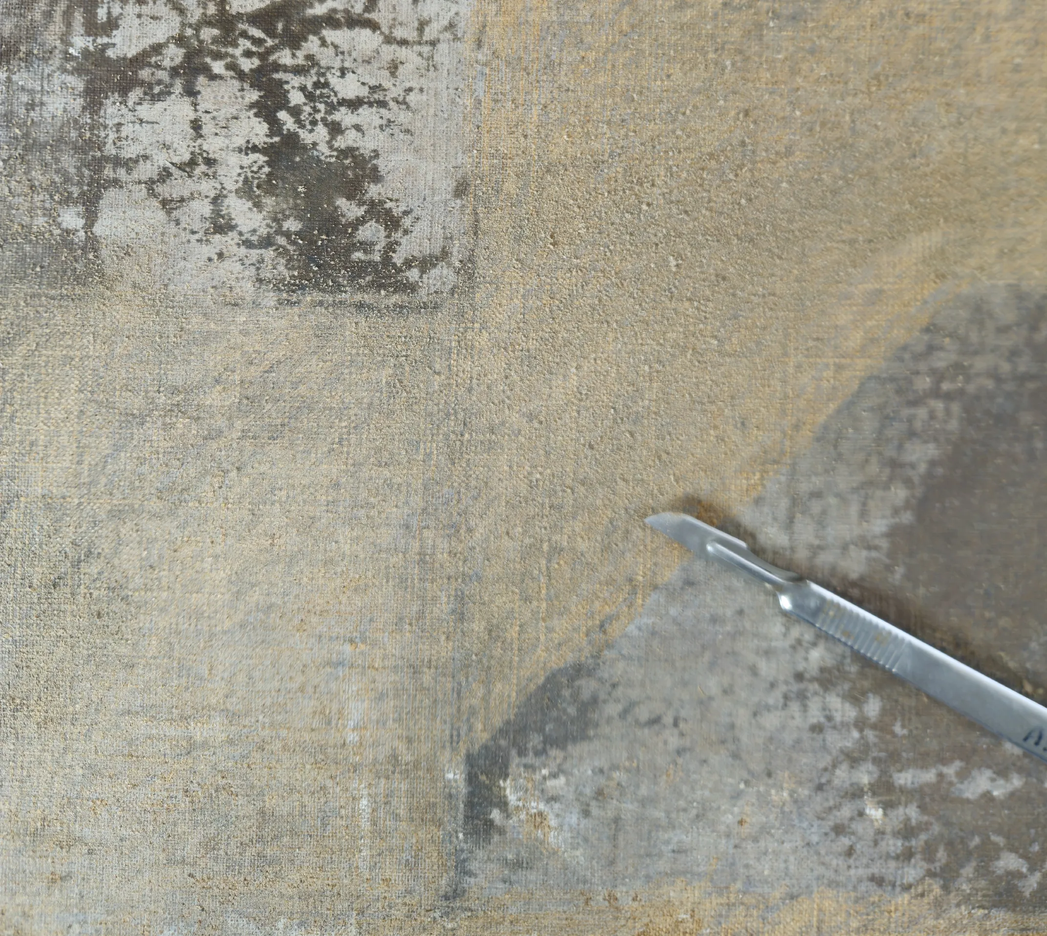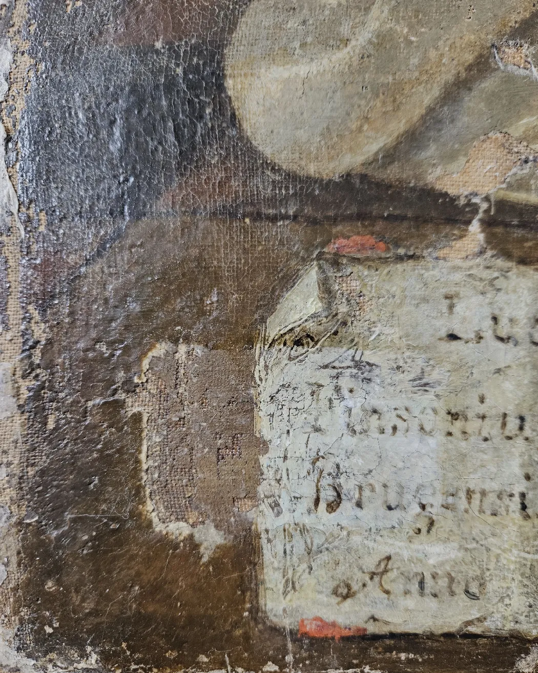 -Au niveau du support : une ancienne restauration grossière a mal évolué et a entrainé plusieurs altérations. Des pièces de différente natures très épaisses collées sur la partie inférieure du revers ont déformé la toile et engendré des soulèvements et des lacunes. Elles renforcées des anciennes déchirures. Une fine couche d’enduit cireux était passée sur le revers contraignant le support.