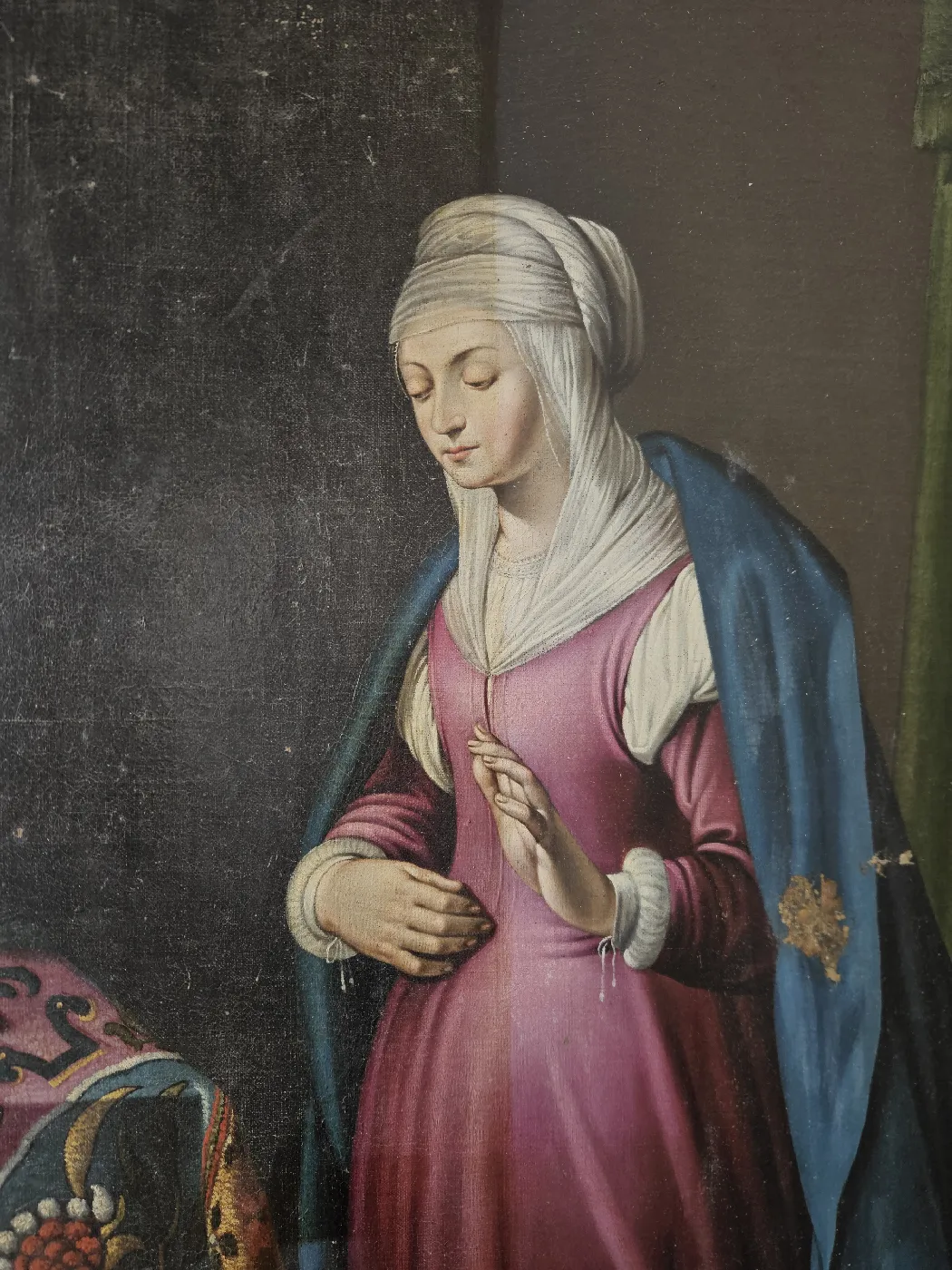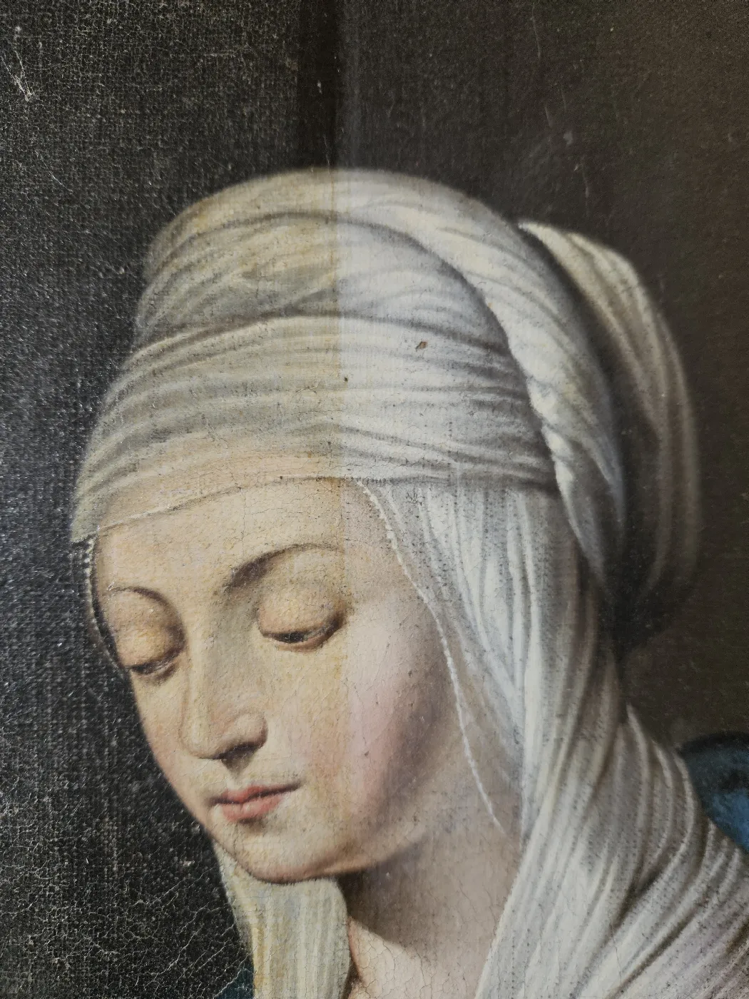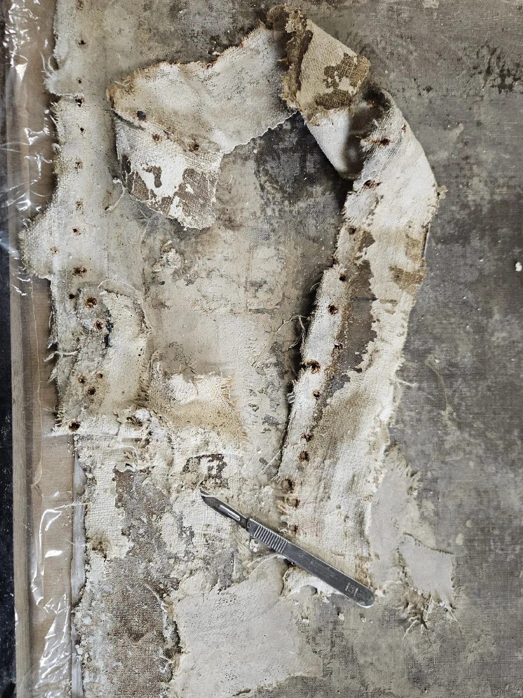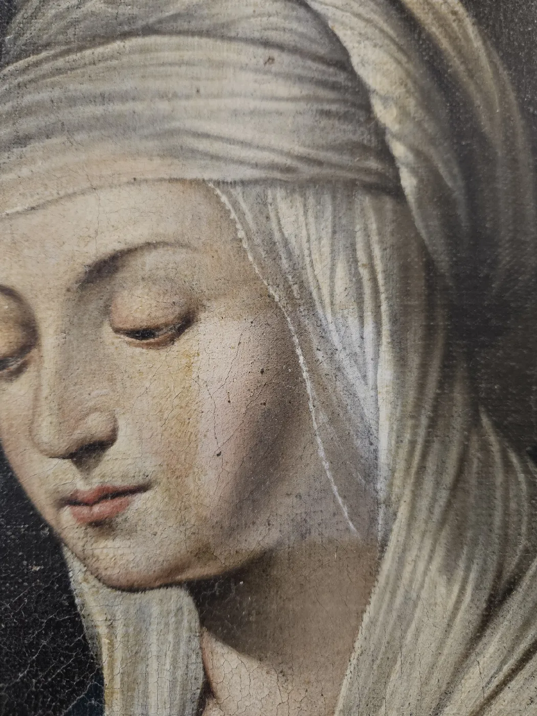 -Au niveau du support : une ancienne restauration grossière a mal évolué et a entrainé plusieurs altérations. Des pièces de différente natures très épaisses collées sur la partie inférieure du revers ont déformé la toile et engendré des soulèvements et des lacunes. Elles renforcées des anciennes déchirures. Une fine couche d’enduit cireux était passée sur le revers contraignant le support.