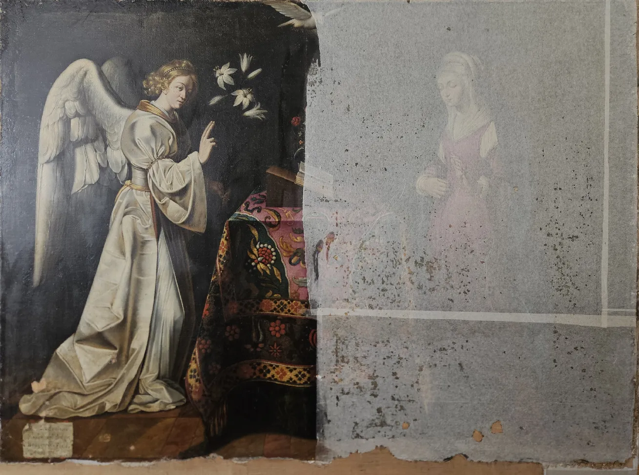 La couche picturale a été décrassée. Le vernis, les repeints et les mastics débordants ont été progressivement retirés. Les lacunes ont été mastiquées. Elles sont actuellement en cours de réintégration.