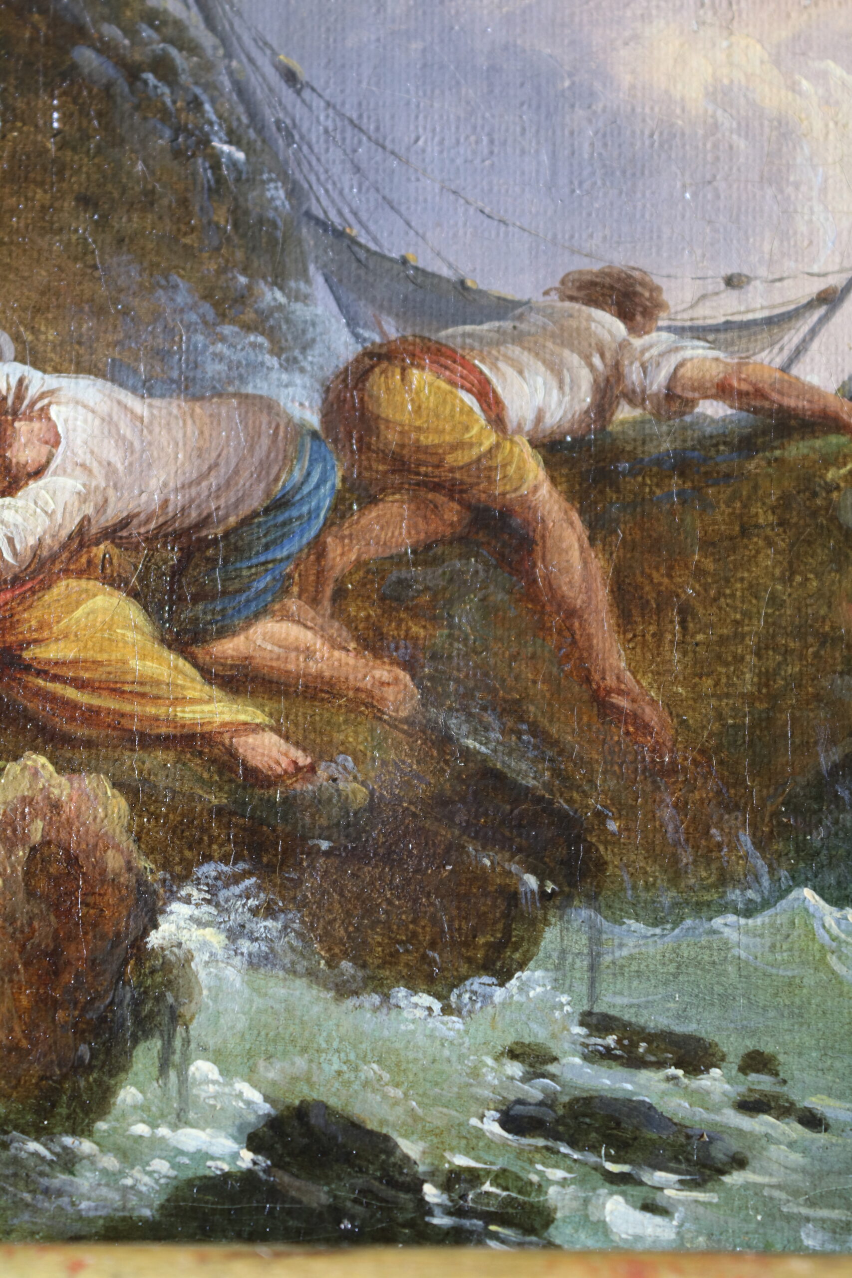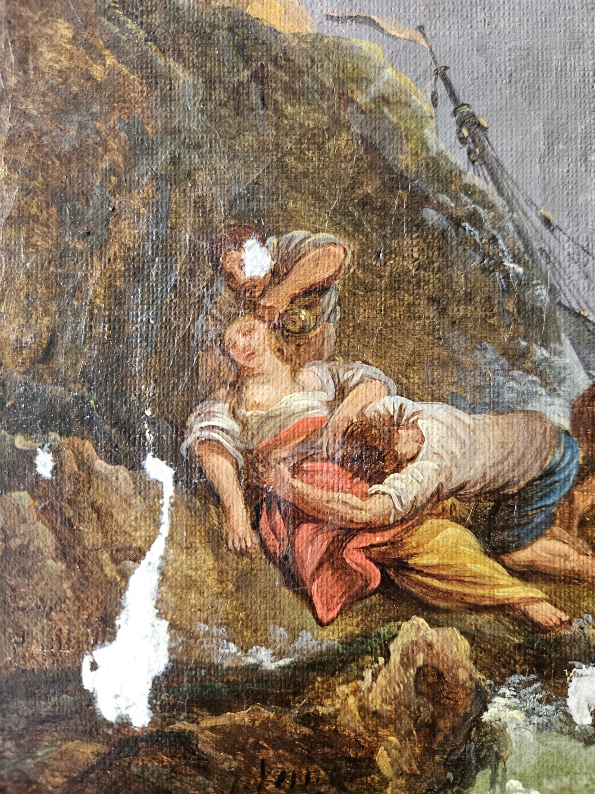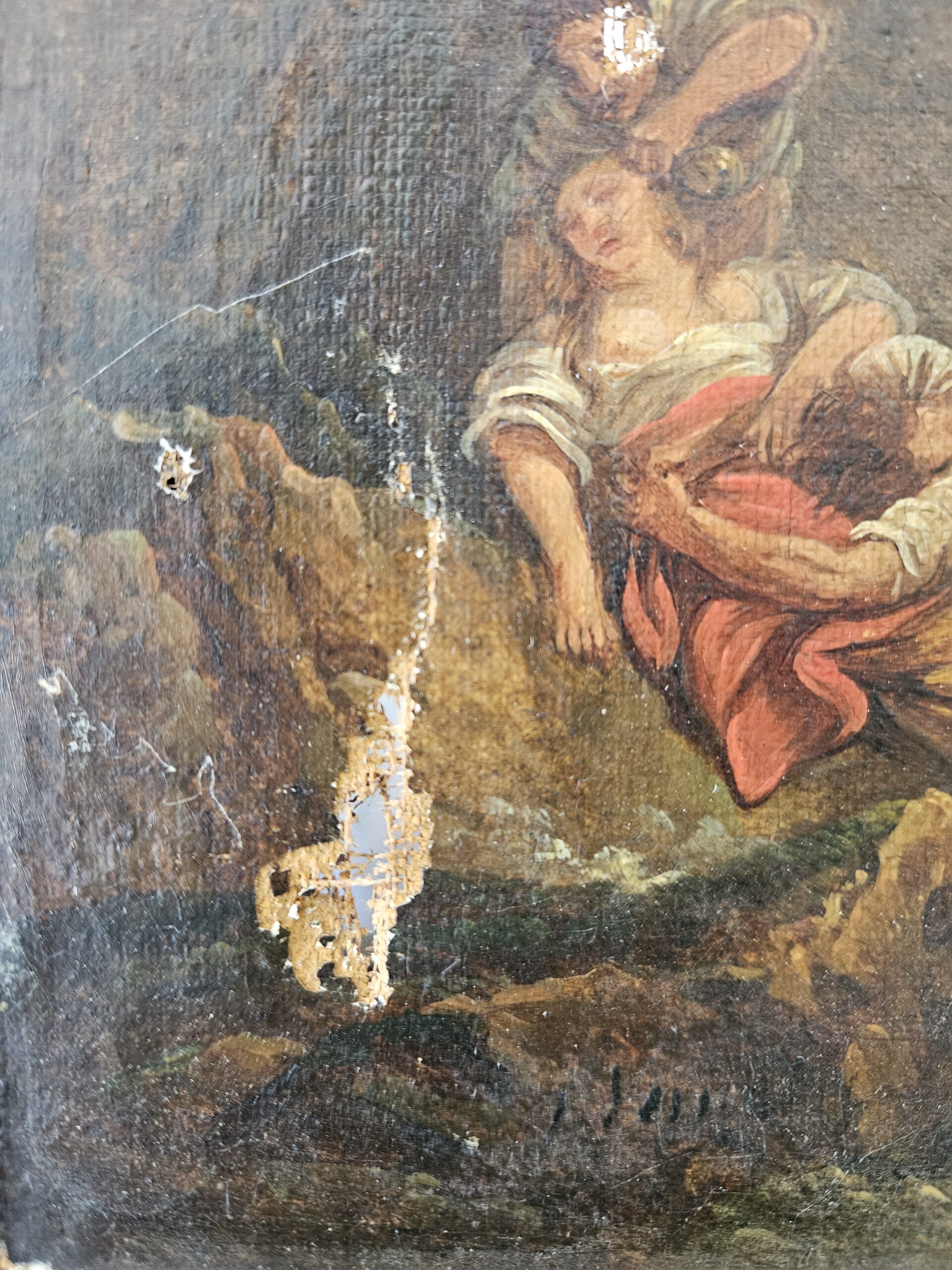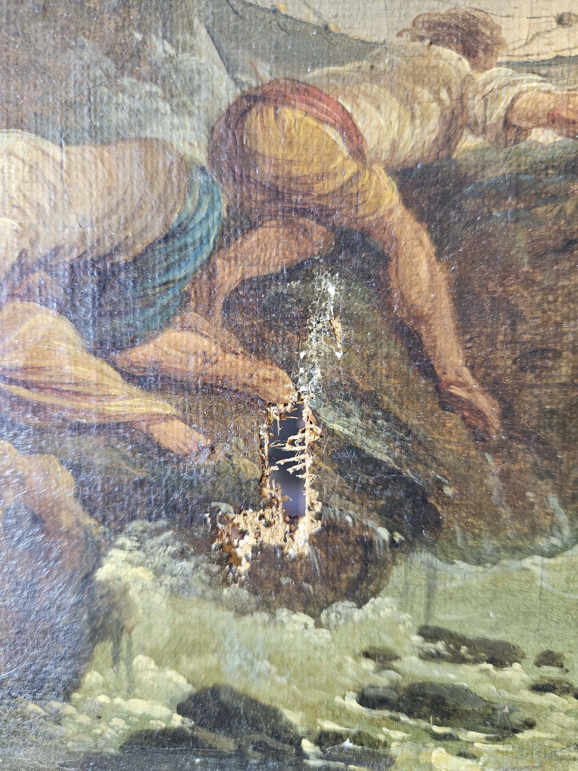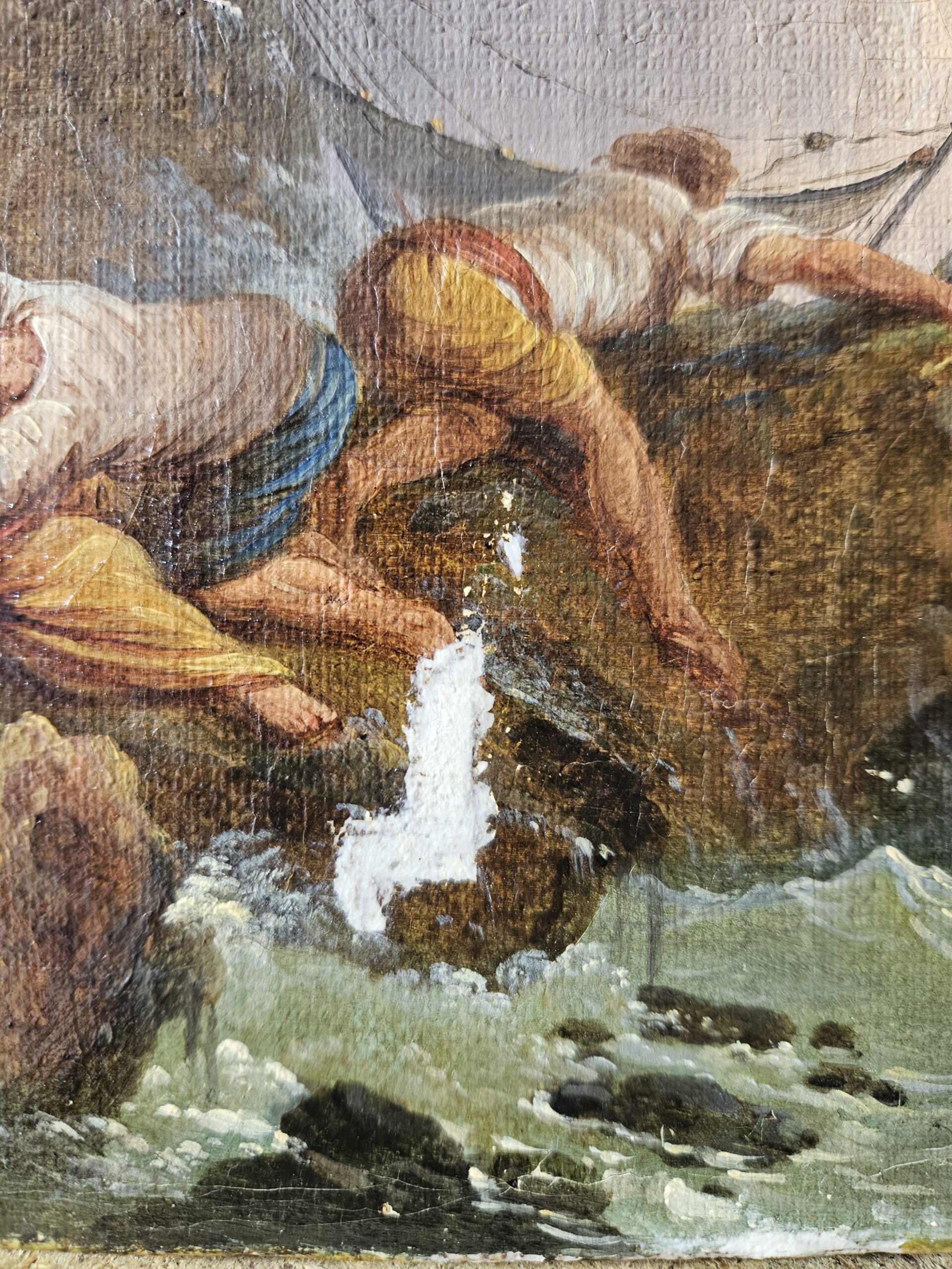 Ce tableau présenté 6 ruptures de toile plus ou moins grande et un vernis devenu jaune qui modifié les couleurs d’origine. Les lacunes de toile ont été consolidées par incrustation de toile puis renforcées par collage de pièce au revers. Le vernis oxydé a été retiré.