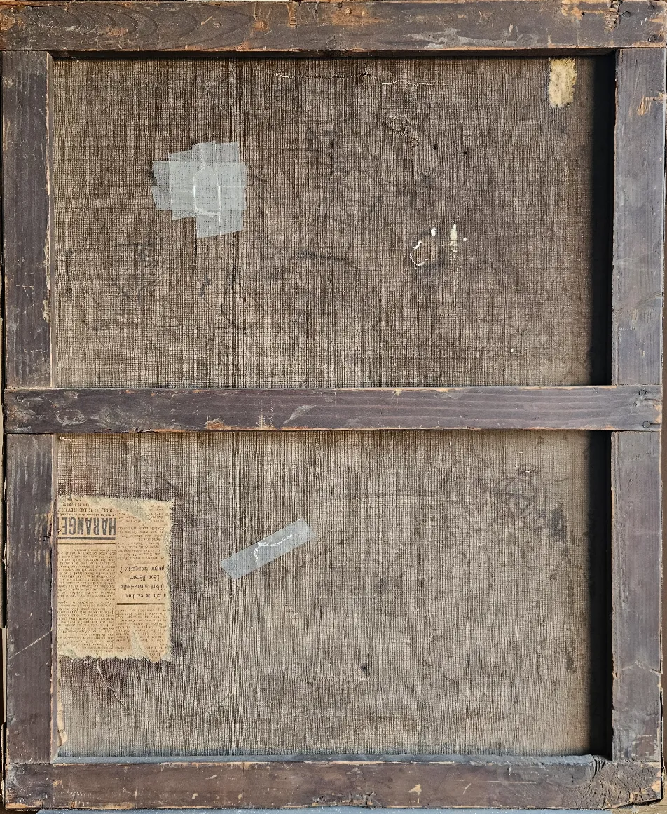 Les interventions étaient les suivantes : Dépose de la toile et tension provisoire sur un bâti extensible permettant les opérations de conservation en toute sécurité : retrait des différentes pièces, consolidation des déchirures et pose des pièces de renfort. Résorption des déformations de la toile à l’aide d’un apport d’humidité, de chaleur et de tension. Le collage d’un intissé au revers vient renforcer dans sa globalité le support. Une nouvelle tension a été réalisée sur un châssis neuf à clés sur mesure car le châssis d’origine était trop fragile.