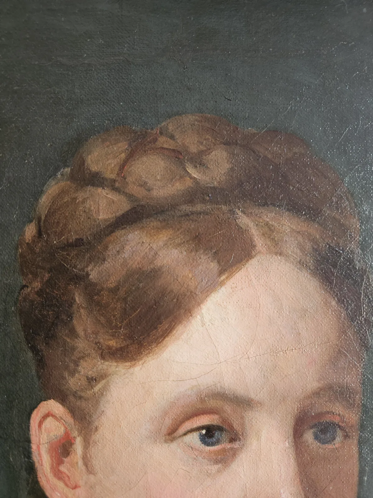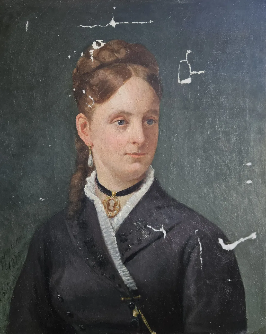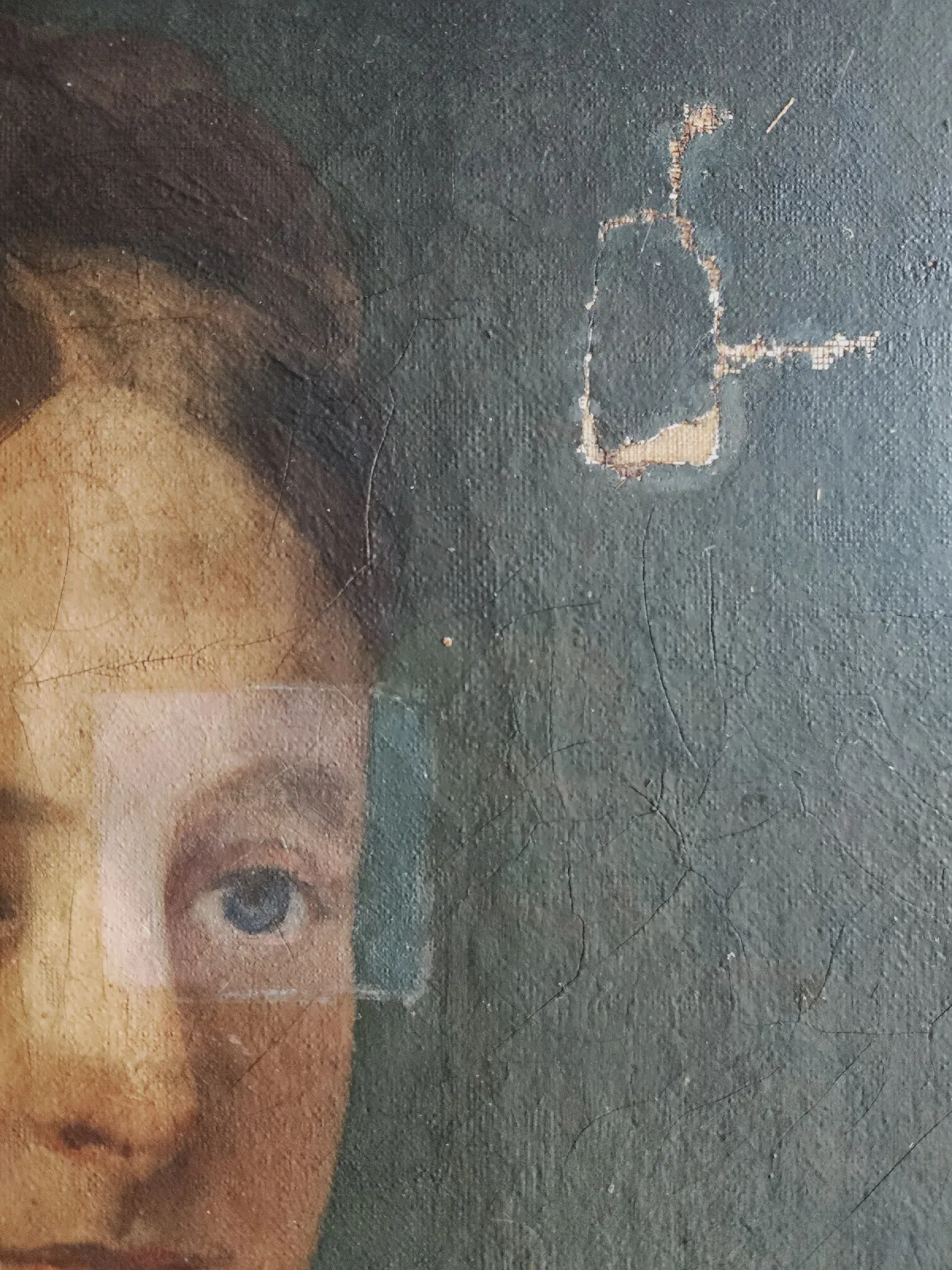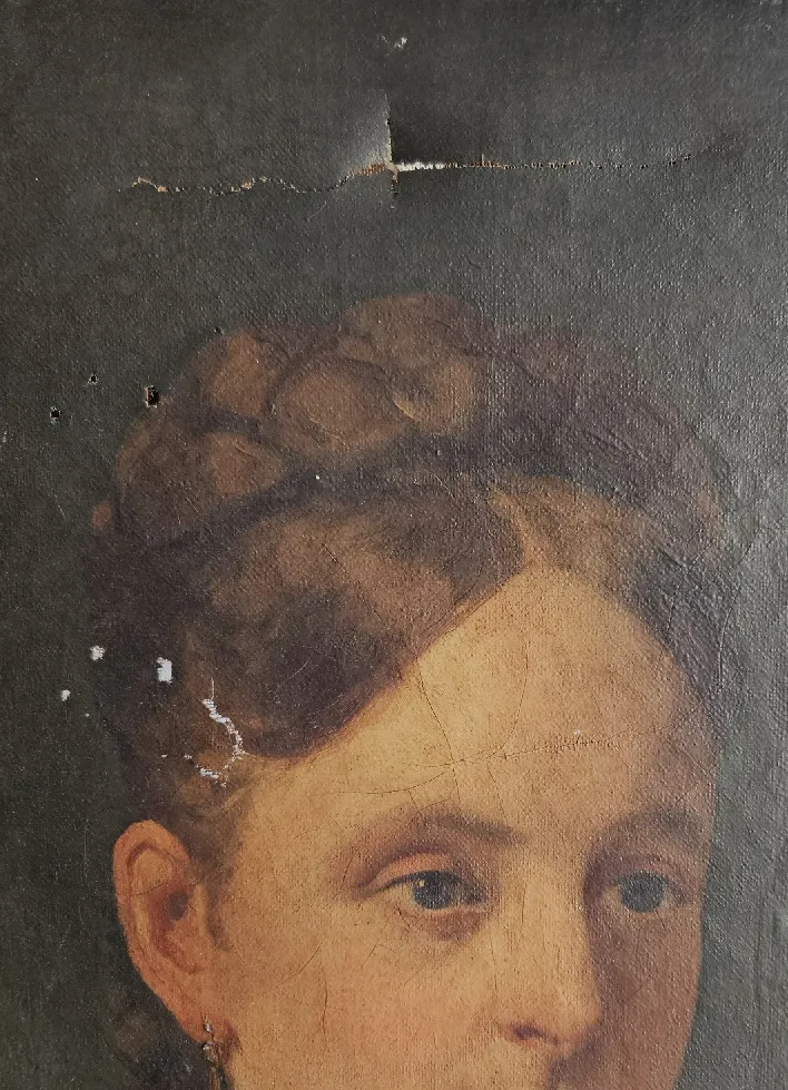 – Au niveau du support : des déchirures, certaines étaient renforcées par des pièces de différentes natures (papier journal, toile de lin épaisse et scotch). La toile présentait des déformations et elle était oxydée, elle avait perdu sa souplesse.